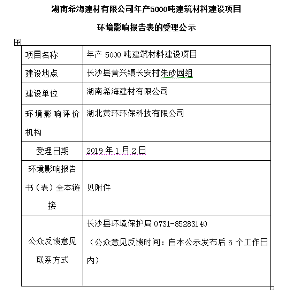 湖南希海建材有限公司年產(chǎn)5000噸建筑材料建設(shè)項(xiàng)目環(huán)境影響報(bào)告表的受理公示