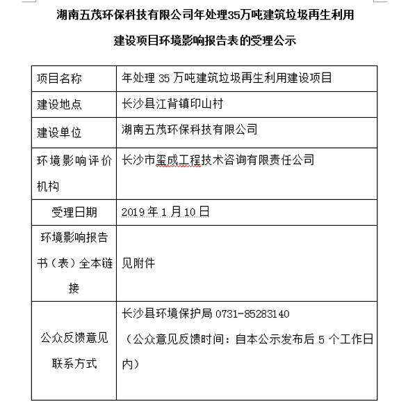 湖南五茂環(huán)??萍加邢薰灸晏幚?5萬(wàn)噸建筑垃圾再生利用建設(shè)項(xiàng)目環(huán)境影響報(bào)告表的受理公示