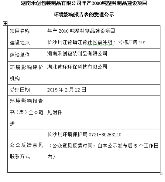 湖南禾創(chuàng)包裝制品有限公司年產(chǎn)2000噸塑料制品建設項目環(huán)境影響報告表的受理公示