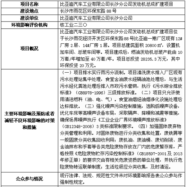 關(guān)于比亞迪汽車工業(yè)有限公司長(zhǎng)沙分公司發(fā)動(dòng)機(jī)總成擴(kuò)建項(xiàng)目環(huán)境影響評(píng)價(jià)文件審批前公示