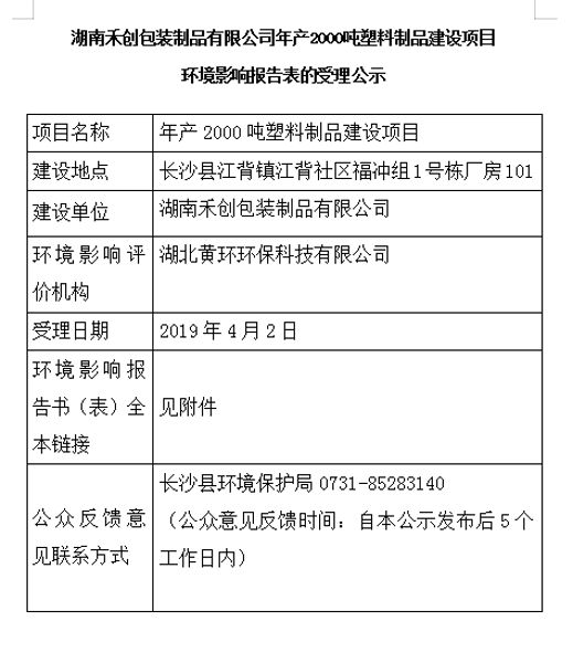 湖南禾創(chuàng)包裝制品有限公司年產(chǎn)2000噸塑料制品建設(shè)項(xiàng)目環(huán)境影響報(bào)告表的受理公示