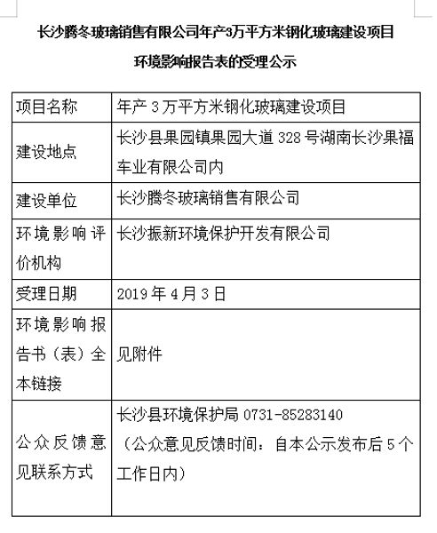 長(zhǎng)沙騰冬玻璃銷售有限公司年產(chǎn)3萬(wàn)平方米鋼化玻璃建設(shè)項(xiàng)目環(huán)境影響報(bào)告表的受理公示