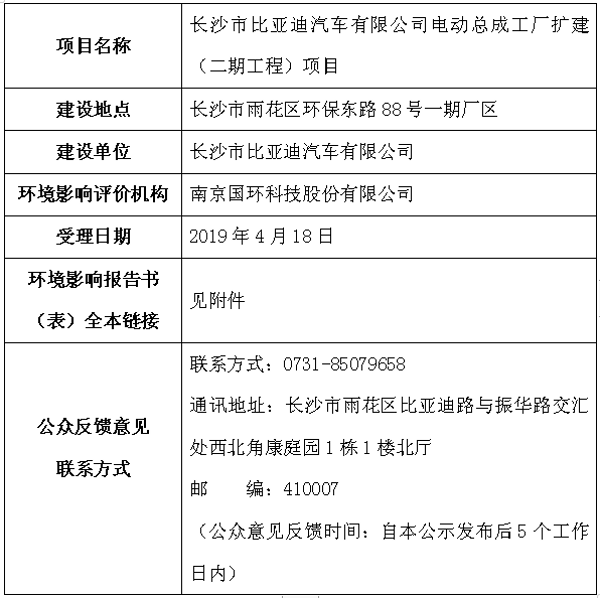 關(guān)于長沙市比亞迪汽車有限公司電動總成工廠擴(kuò)建(二期工程)項(xiàng)目環(huán)境影響評價(jià)文件受理情況公示