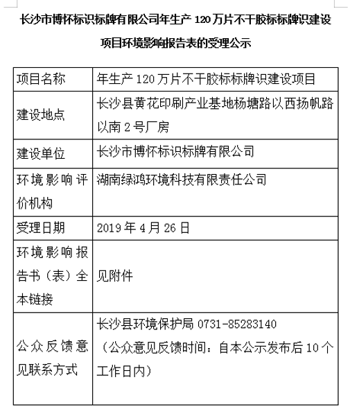 長沙市博懷標(biāo)識標(biāo)牌有限公司年生產(chǎn)120萬片不干膠標(biāo)標(biāo)牌識建設(shè)項目環(huán)境影響報告表的受理公示