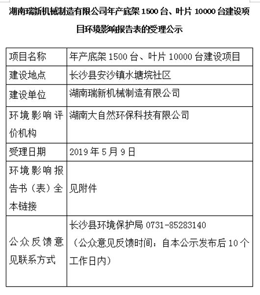 湖南瑞新機(jī)械制造有限公司年產(chǎn)底架1500臺、葉片10000臺建設(shè)項(xiàng)目環(huán)境影響報(bào)告表的受理公示