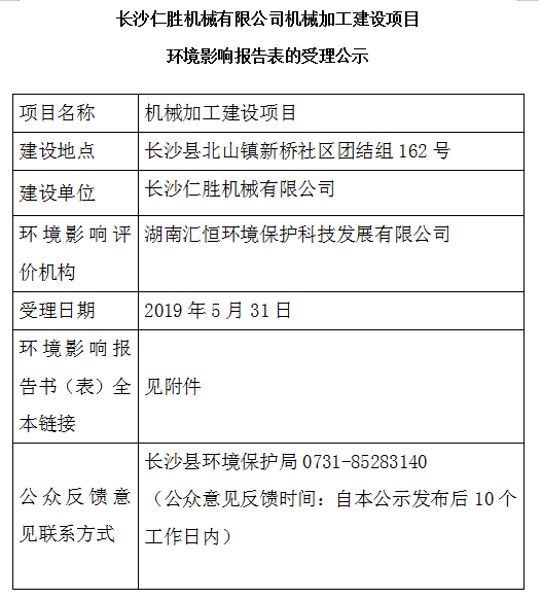 長沙仁勝機械有限公司機械加工建設(shè)項目環(huán)境影響報告表的受理公示