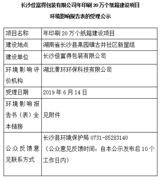 長沙佳富得包裝有限公司年印刷20萬個(gè)紙箱建設(shè)項(xiàng)目環(huán)境影響報(bào)告表的受理公示