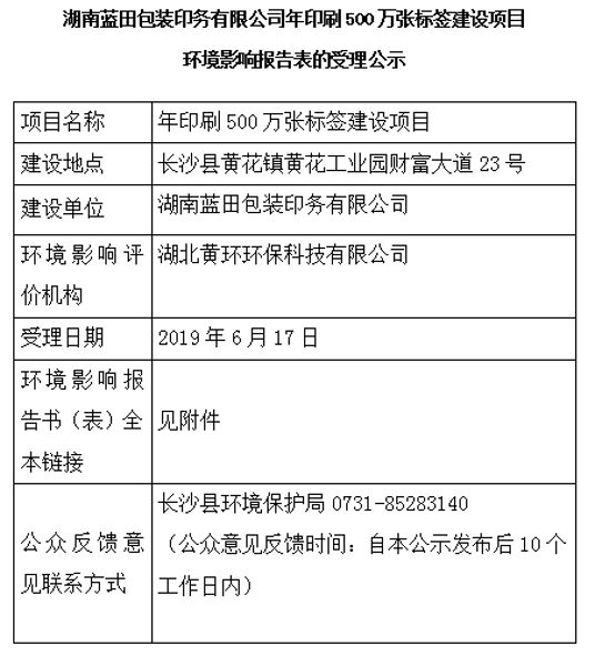 湖南藍(lán)田包裝印務(wù)有限公司年印刷500萬張標(biāo)簽建設(shè)項目環(huán)境影響報告表的受理公示