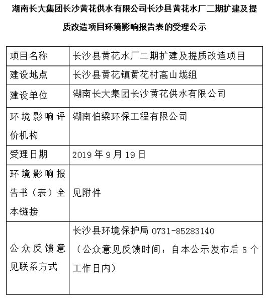 湖南長大集團長沙黃花供水有限公司長沙縣黃花水廠二期擴建及提質(zhì)改造項目環(huán)境影響報告表的受理公示