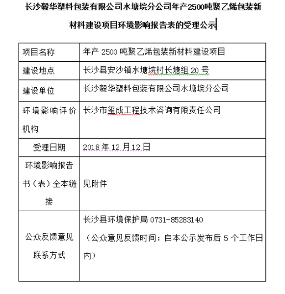 長(zhǎng)沙毅華塑料包裝有限公司水塘垸分公司年產(chǎn)2500噸聚乙烯包裝新材料建設(shè)項(xiàng)目環(huán)境影響報(bào)告表的受理公示
