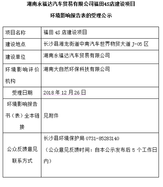 湖南永福達(dá)汽車貿(mào)易有限公司福田4S店建設(shè)項目環(huán)境影響報告表的受理公示
