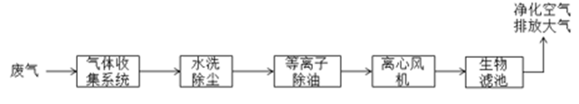 廢氣收集后經(jīng)水洗除塵降溫、等離子除油處理后通過(guò)生物濾池,通過(guò)濕潤(rùn)、多孔和充滿活性微生物的濾層,濾層中微生物對(duì)廢氣中污染物進(jìn)行吸附、吸收和降解,將污染物質(zhì)分解成二氧化碳、水和其他無(wú)機(jī)物,完成降解過(guò)程,經(jīng)凈化后達(dá)標(biāo)排放。
