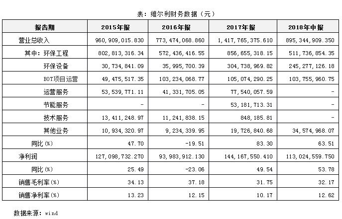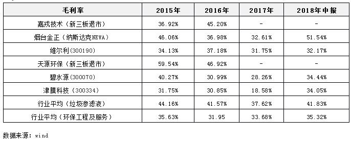 2018年中期垃圾滲濾液行業(yè)平均的毛利率在41%左右,整體環(huán)保工程及服務(wù)行業(yè)毛利率在35%左右。列舉幾家同行公司毛利率做如下比較: