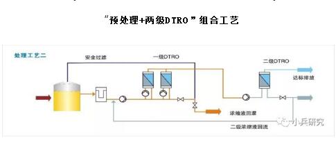工藝特點(diǎn):“預(yù)處理+兩級碟管式反滲透(DTRO)”處理系統(tǒng)集成度和自動化程度較高,操作方便,占地面積相對常規(guī)處理工藝小。但與常規(guī)處理工藝一樣需要考慮濃縮液的處理處置問題,本工藝屬于單純的物理截留工藝,滲濾液中的污染物多被截留到濃縮液中,因此濃縮液處理難度更大。