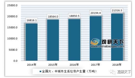 隨著我國城市化生活的進程加快,再加上居民生活水平的不斷提升,城市生活垃圾產(chǎn)生量保持穩(wěn)定増長的趨勢,近年來我國已成為世界上城市生活垃圾處理壓力最大的國家之一。根據(jù)《2018年全國大、中城市固體廢物污染環(huán)境防治年報》,2017年,202個大、中城市生活垃圾產(chǎn)生量20194.4萬噸,處置量20084.3萬噸,處置率達99.5%。