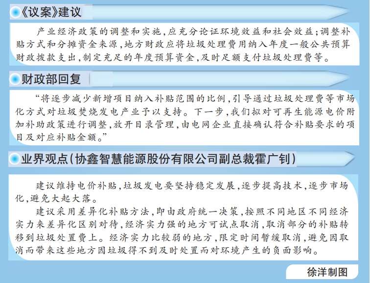 關(guān)于對(duì)垃圾發(fā)電項(xiàng)目予以補(bǔ)貼的問題,經(jīng)財(cái)政部、發(fā)展改革委、國家能源局、行業(yè)協(xié)會(huì)等方面認(rèn)真研究,一方面,我們擬對(duì)已有項(xiàng)目延續(xù)現(xiàn)有補(bǔ)貼政策;另一方面,考慮到垃圾焚燒發(fā)電項(xiàng)目效率低、生態(tài)效益欠佳等情況,將逐步減少新增項(xiàng)目納入補(bǔ)貼范圍的比例,引導(dǎo)通過垃圾處理費(fèi)等市場(chǎng)化方式對(duì)垃圾焚燒發(fā)電產(chǎn)業(yè)予以支持。下一步,我們擬對(duì)可再生能源電價(jià)附加補(bǔ)助政策進(jìn)行調(diào)整,放開目錄管理,由電網(wǎng)企業(yè)直接確認(rèn)符合補(bǔ)貼要求的項(xiàng)目及對(duì)應(yīng)補(bǔ)貼金額。”財(cái)政部在回復(fù)中表示。