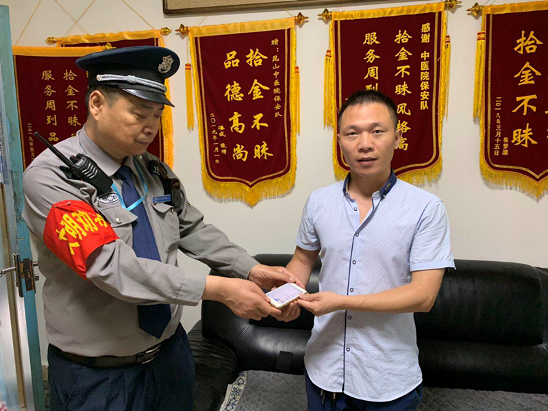 2019年7月9日上午9點(diǎn)半左右,保安公司駐中醫(yī)院保安員周沈撿到一部蘋果手機(jī),經(jīng)過(guò)多方尋找,終于尋得失主并將手機(jī)歸還。