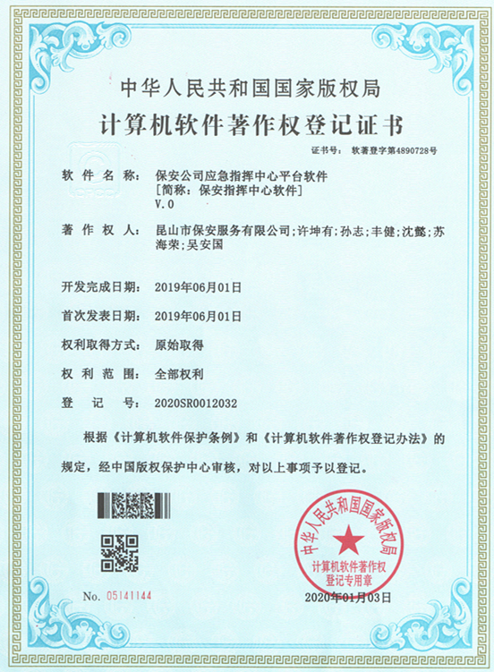 近日,根據(jù)《計(jì)算機(jī)軟件保護(hù)條例》和《計(jì)算機(jī)軟件著作權(quán)登記辦法》規(guī)定,經(jīng)中國版權(quán)保護(hù)中心審核,保安公司應(yīng)急指揮中心平臺軟件被正式授予《中華人民共和國國家版權(quán)局計(jì)算機(jī)軟件著作權(quán)登記證書》,證書號為:軟著登記字第4890728號。