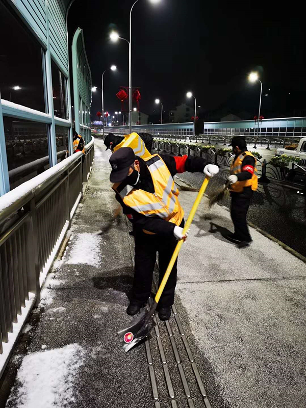 2月15日夜間,2020年昆山的第一場(chǎng)雪悄然而至,為了防止路面積雪對(duì)行人、車輛影響,公司結(jié)合業(yè)務(wù)板塊,迅速啟動(dòng)應(yīng)急預(yù)案,組織亭林城管中隊(duì)、柏廬城管中隊(duì)、朝陽(yáng)城管中隊(duì)30名城管協(xié)管員前往正陽(yáng)橋、長(zhǎng)虹大橋、玉峰大橋、繡衣大橋和南城河岸西城河岸景觀橋等橋梁、路面開(kāi)展除冰掃雪行動(dòng)。隊(duì)員按照應(yīng)急預(yù)案,明確責(zé)任,細(xì)化分工,重點(diǎn)對(duì)橋面行人通道與坡度路面進(jìn)行集中清掃,防止積雪成冰。
