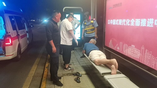 當(dāng)日,線春賢巡查至花橋金融大道公交車站臺時發(fā)現(xiàn)一名老人在站臺座椅趴著不動,于是他馬上上前觀察其生命體征,在撥打120、110的同時通知負責(zé)人吳群中以及中班隊長任洪兵,二個人立刻趕到現(xiàn)場,協(xié)助其進行處理,經(jīng)120現(xiàn)場確認老人沒有大礙,我方聯(lián)勤隊員安全將老人移交給110。