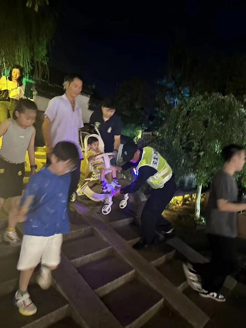 10月7日晚上19點(diǎn)左右,在周莊古鎮(zhèn)內(nèi)一名游客獨(dú)自帶著小朋友從周莊古鎮(zhèn)景區(qū)出來(lái),在下青龍橋的時(shí)候,由于兒童推車有點(diǎn)不好推下去,為保護(hù)兒童安全,游客走的小心翼翼,安保公司下屬保安員發(fā)現(xiàn)后立即上前幫忙一起把兒童推車抬到平地上。