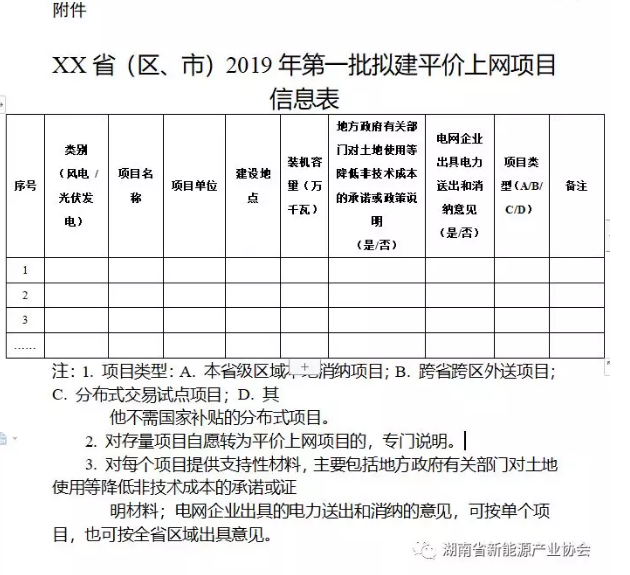 請有關?。▍^(qū)、市)發(fā)展改革委(能源局)按附件表格填報擬建平價上網項目的信息,并提供項目所在地地方政府出具的有關項目土地等降低非技術成本相關政策的承諾或說明材料、電網企業(yè)出具的電力送出和消納的意見,同時在國家可再生能源信息管理系統(tǒng)在線填報相關信息。國家能源主管部門將公布風電、光伏發(fā)電無補貼平價上網項目名單,督促協(xié)調有關方面落實平價上網項目有關支持政策。