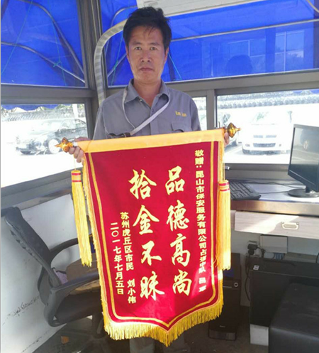 近日,保安公司停車收費中隊收到一面市民贈送的錦旗,原來是7月4日下午,停車收費員呂軍在中山路停車場巡視時,在崗亭附近撿到一只黑白混色背包,發(fā)現(xiàn)包內(nèi)有多件電子產(chǎn)品及重要證件,隨后呂軍立即向110指揮中心報告了情況,后通過警方的幫助找到了失主,失主為了表達感激之情,特贈送了一面致謝錦旗。