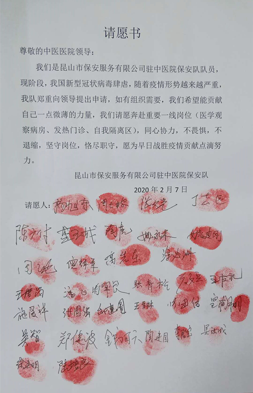 “我們請愿奔赴重要一線崗位(醫(yī)學觀察病房、發(fā)熱門診、自我隔離區(qū)),同心協(xié)力,不畏懼,不退縮...”。2月7日,保安公司中醫(yī)院安保隊30多名安保人員向公司遞交了請愿書,志愿加入中醫(yī)院防疫重要一線安保工作。