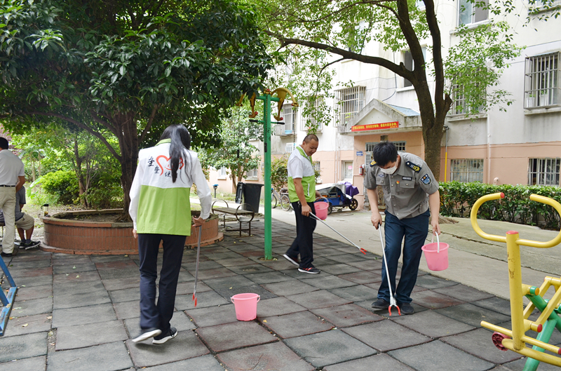 為激發(fā)一線保安員在文明創(chuàng)建中的主動性,本次活動以黨員先鋒帶頭,吸納一線保安員一同參與。烈日炎炎的下午,皇倉涇社區(qū)滿庭芳小區(qū)中出現(xiàn)一抹清新的“志愿綠”,13名志愿者積極向小區(qū)居民宣傳文明城市創(chuàng)建理念,并就垃圾分類工作向居民開展答疑解惑。活動中,志愿者們身體力行,帶著垃圾桶和垃圾鉗,認真清理小區(qū)道路、綠化帶、鍛練場所等衛(wèi)生死角,為小區(qū)居民營造干凈整潔的生活環(huán)境。