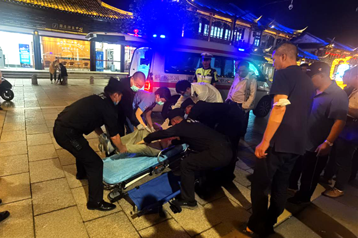 9月25日晚9點左右,安保公司周莊景區(qū)安保隊在巡邏過程中,發(fā)現(xiàn)一名老人倒在地上,滿頭是血,隊員們立即啟動應急預案,將受傷老人送上救護車。